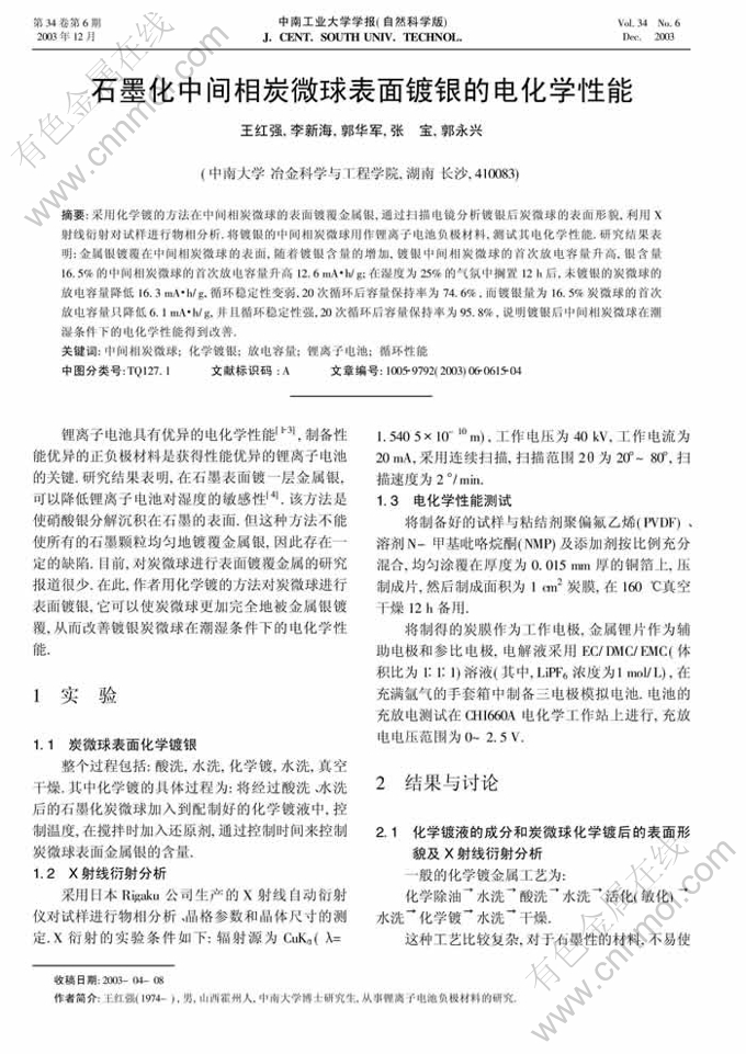 关键词:中间相炭微球;化学镀银;放电容量;锂离子电池;循环性能