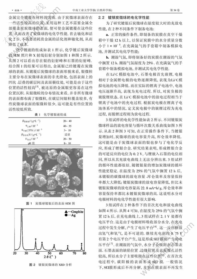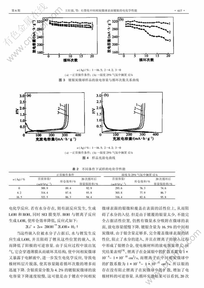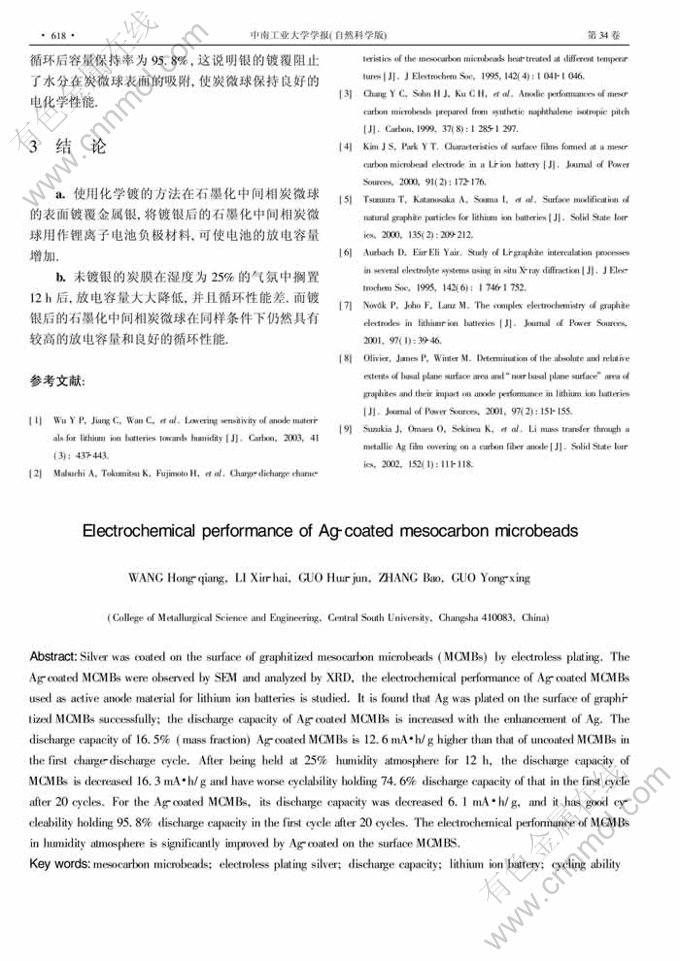 Key words:mesocarbon microbeads; electroless plating silver; discharge capacity; lithium ion battery; cycling ability