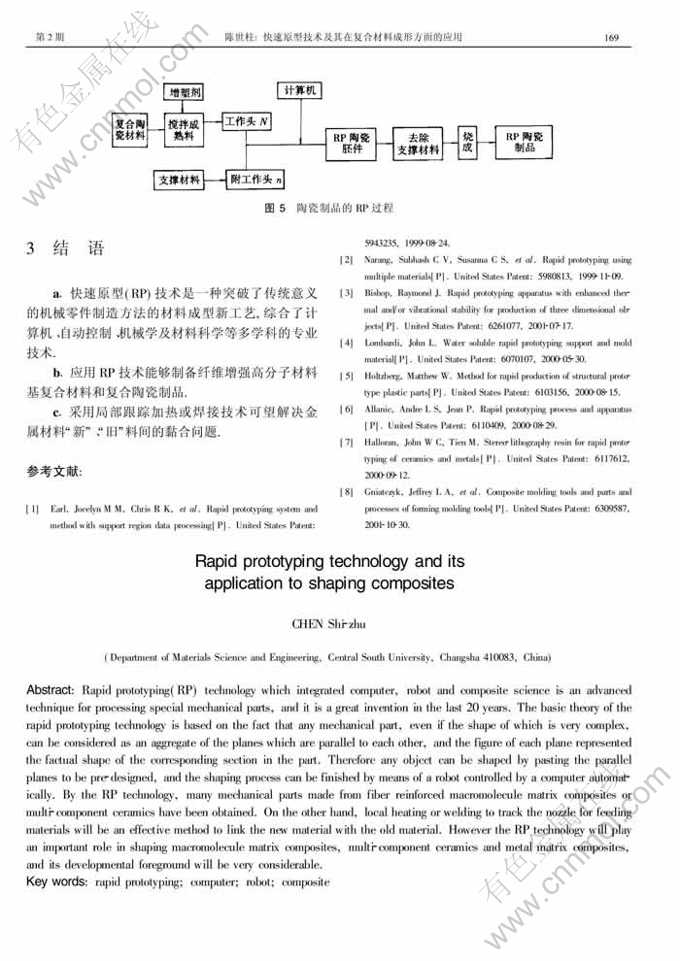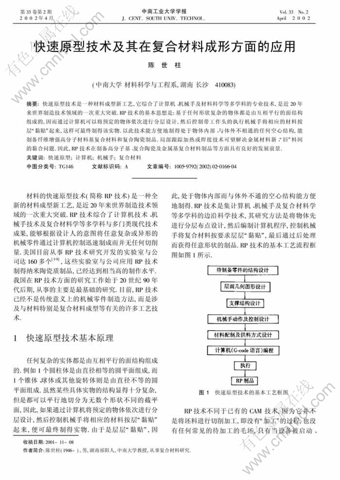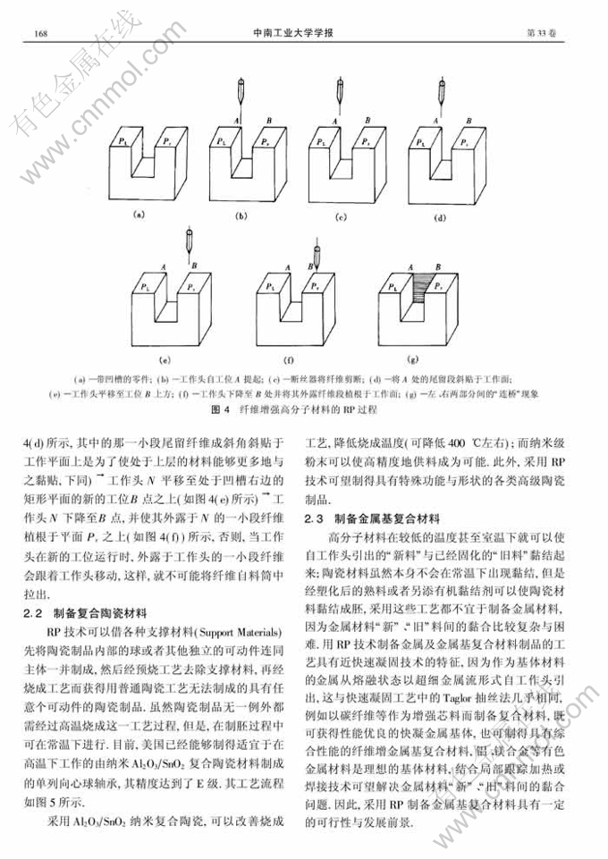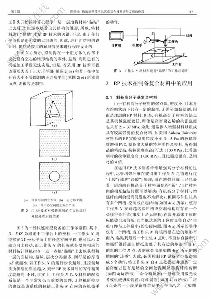 摘 要:快速原型技术是一种材料成型新工艺,它综合了计算机、机械手及材料科学等多学科的专业技术,是近20年来世界制造技术领域的一次重大突破.RP技术的基本思想是:基于任何形状复杂的物体都是由互相平行的面结构组成的,因而通过计算机可以将预定的物体依次进行分层设计,然后控制带工作头的执行机械手将相应的材料按层“黏贴”起来,这样可最终制得该实物.以此技术能方便地制得处于物体内部、与体外不相通的任何空心结构,能制备纤维增强高分子材料基复合材料和复合陶瓷制品.局部跟踪加热或焊接技术可望解决金属材料新、“旧”料间的黏合问题.因此,RP技术在制备高分子基、复合陶瓷及金属基复合材料制品等方面具有良好的发展前景.