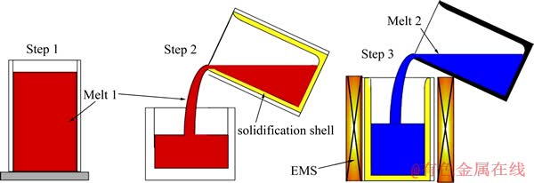 实验材料为3003、4004、5056和AZ91合金,其成分如表1所列。实验所采用的电磁搅拌装置为两相两级对电磁驱动器,其磁搅拌强度通过改变旋转磁场发生器的输入电压来调节,磁场发生器所产生磁场的磁感应强度与输入电压成正比。铸型采用304不锈钢材质,其直径为70 mm,高度为75 mm。将配制好的合金分别在两个井式电阻炉中熔炼,每种合金浇注前都在过热50 ℃的温度下保温20 min左右。具体的实验过程如图1所示。在制备3003/4004铝铝复层铸锭过程中,首先将温度为700 ℃的外层3003合金浇注到不锈钢铸型中,静置10 s后,将铸型中尚未凝固的熔体倾倒出来,获得一壁厚为10~12 mm的凝壳。然后,将温度为600 ℃的4004熔体浇注到3003凝壳中(此时3003凝壳内侧的温度约为560~580 ℃),同时施加旋转磁场,磁场强度约为15 mT。制备5056/AZ91铝镁复层铸锭的方法与上述方法相同,外层5056合金浇注温度为710 ℃,静置时间同样为10 s,凝壳厚度8~10 mm,凝壳温度580~600 ℃,内层AZ91浇注温度为595 ℃,施加磁场强度同样为15 mT。将浇注好的复层铸锭空冷。作为对比,本实验还在相同情况下制得未施加电磁搅拌的试样。最终获得尺寸为d 67 mm× 75 mm 的复层铸锭,将其从距底部15 mm的位置沿横截面剖开,经磨样、抛光,王水V(HCl):V(HNO3)=3:1)腐蚀后观察其宏观组织,5%HF(体积分数)腐蚀后观察其金相组织。采用EPMA-1600电子探针对结合界面成分进行线分析及微区成分分析。使用Shimadzu XRD-6000 X射线分析仪对5056/AZ91复合铸锭界面进行检测,以确定其相组成,其操作电压为40 kV,操作电流为30 mA,扫描范围从20°~100°,扫描速度为4 (°)/min。