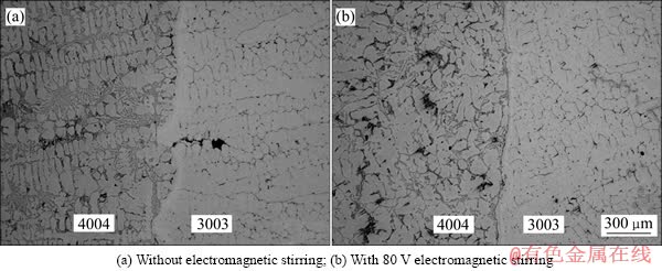 1) 在未加电磁搅拌及施加80 V电磁搅拌的情况下,成功制得界面复合良好的3003/4004铝合金复层材料,经过电磁搅拌处理的铸坯,其心部晶粒组织比相同条件下未经电磁搅拌处理的铸坯组织更为细小。