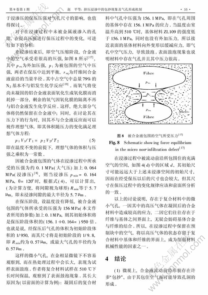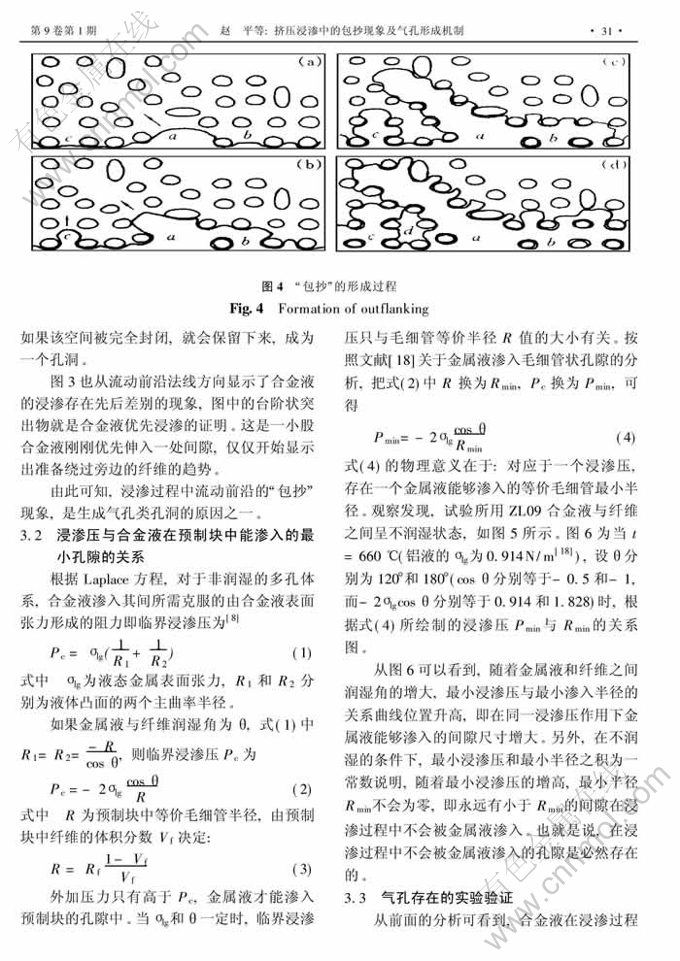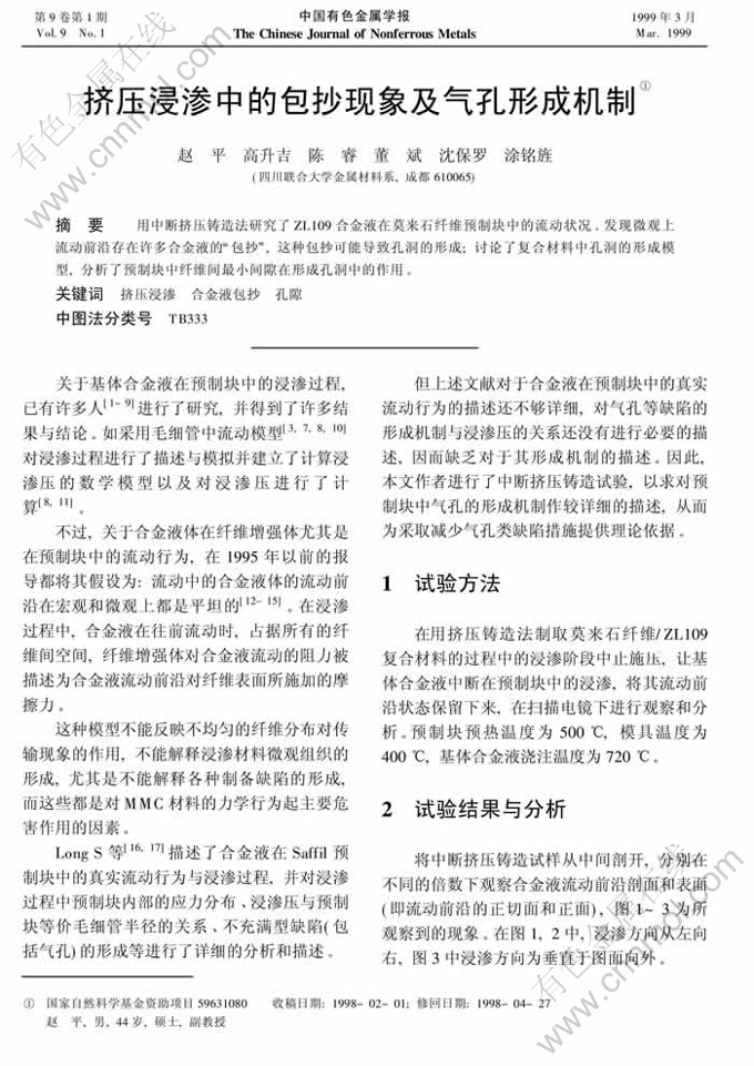 摘 要:用中断挤压铸造法研究了ZL109合金液在莫来石纤维预制块中的流动状况。 发现微观上流动前沿存在许多合金液的“包抄”, 这种包抄可能导致孔洞的形成; 讨论了复合材料中孔洞的形成模型, 分析了预制块中纤维间最小间隙在形成孔洞中的作用。