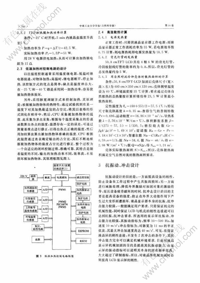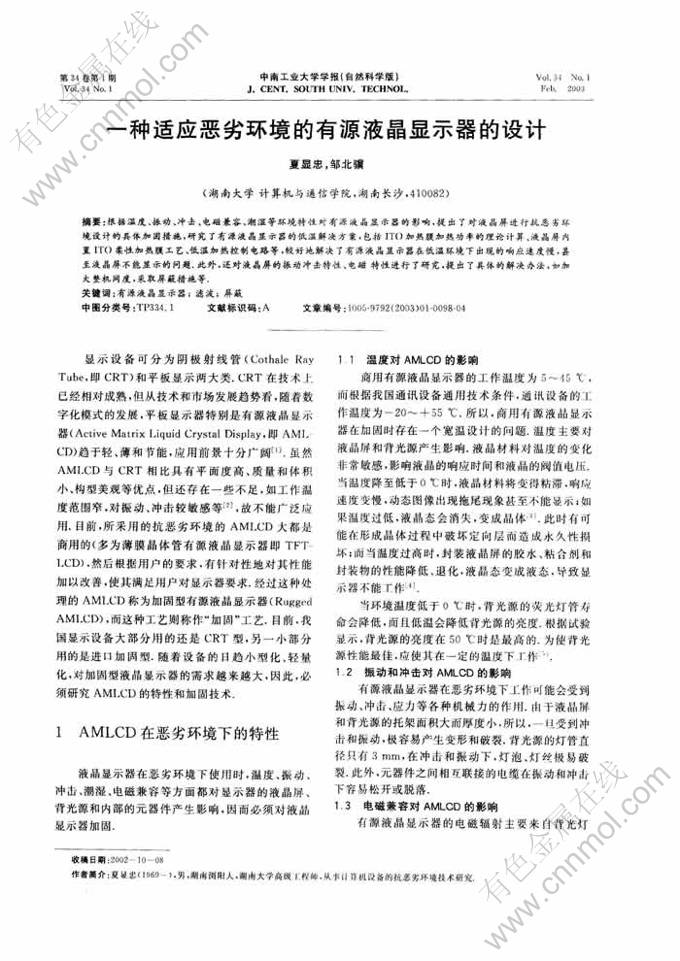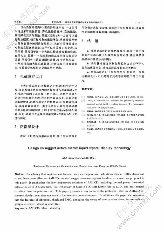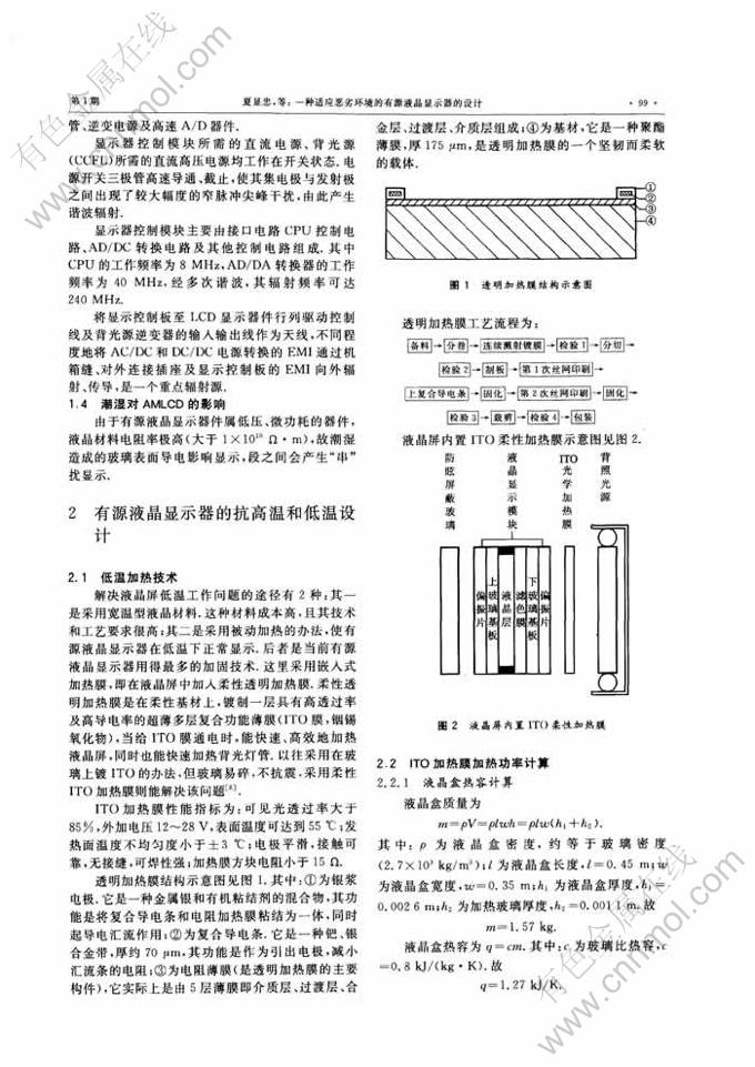 摘 要:根据温度、振动、冲击、电磁兼容、潮湿等环境特性对有源液晶显示器的影响,提出了对液晶屏进行抗恶劣环境设计的具体加固措施,研究了有源液晶显示器的低温解决方案,包括ITO加热膜加热功率的理论计算、液晶屏内置ITO柔性加热膜工艺、低温加热控制电路等。较好地解决了有源液晶显示器在低温环境下出现的响应速度慢.甚至液晶屏不能显示的问题.此外,还对液晶屏的振动冲击特性、电磁特性进行了研究,提出了具体的解决办法,如加大整机网度,采取屏蔽措施等.