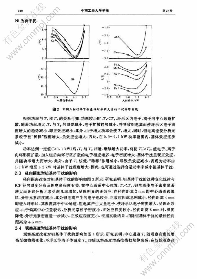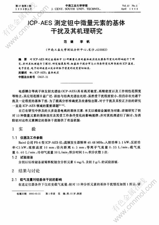摘 要:对ICP-AES测定金属钽中13种微量元素的基体效应及仪器条件变化的影响进行了研究,并对其机理进行了探讨.研究结果表明,钽基体干扰分布与工作条件变化所导致的ICP温度、电子密度、电子运动速度以及分析粒子密度的改变密切相关.