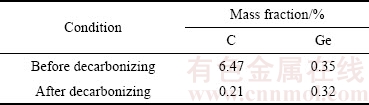 粉煤灰中C含量并不稳定,在研究C含量对粉煤灰中锗富集的影响前,先进行脱碳处理。将粉煤灰在温度为550 ℃的马弗炉中保温3 h,当粉煤灰中存在极少火星时,取出空冷。将冷却的粉煤灰进行C含量和锗含量分析,表2给出了脱C前后粉煤灰中C和Ge含量的变化。通过表2可以看出经过脱C处理后粉煤灰中的C几乎全部被处理掉,Ge的变化并不大,说明脱C处理对粉煤灰锗含量影响不大,工艺合理。
