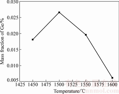 称量100 g C含量为3%,碱度为1.0的粉煤灰分别放入Al2O3坩埚中,分别在1450、1500、1550和1600 ℃的管式高温炉中保温1 h,取出空冷,对冷却后的残余渣料进行分析,图5给出了不同温度对粉煤灰富集后渣中残余锗含量的影响。从图5可以看出当温度为1600 ℃时,粉煤灰中锗富集后的残余渣中锗含量最低,渣中锗含量达到了0.0062%较低的水平,而1500 ℃时残渣中锗含量为0.0266%,1550 ℃时为0.0196%,都相对较高,说明1600 ℃时挥发出的锗量最大,最有利于锗的富集。