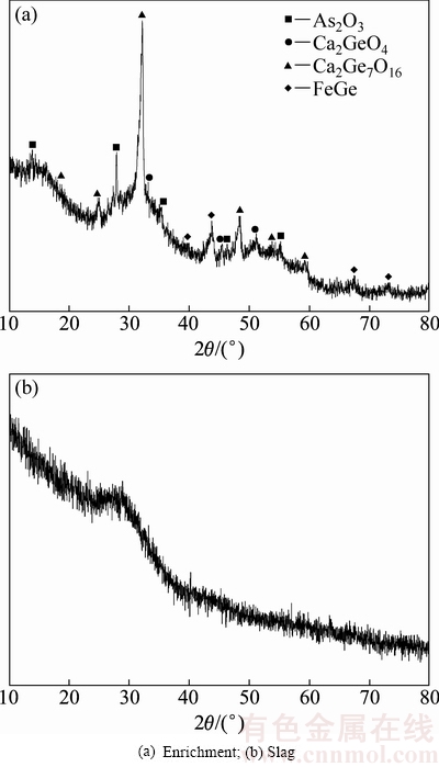 为进一步研究高温火法二次富集工艺后锗的存在形态,对锗富集物和渣进行XRD物相分析,结果如图7所示。