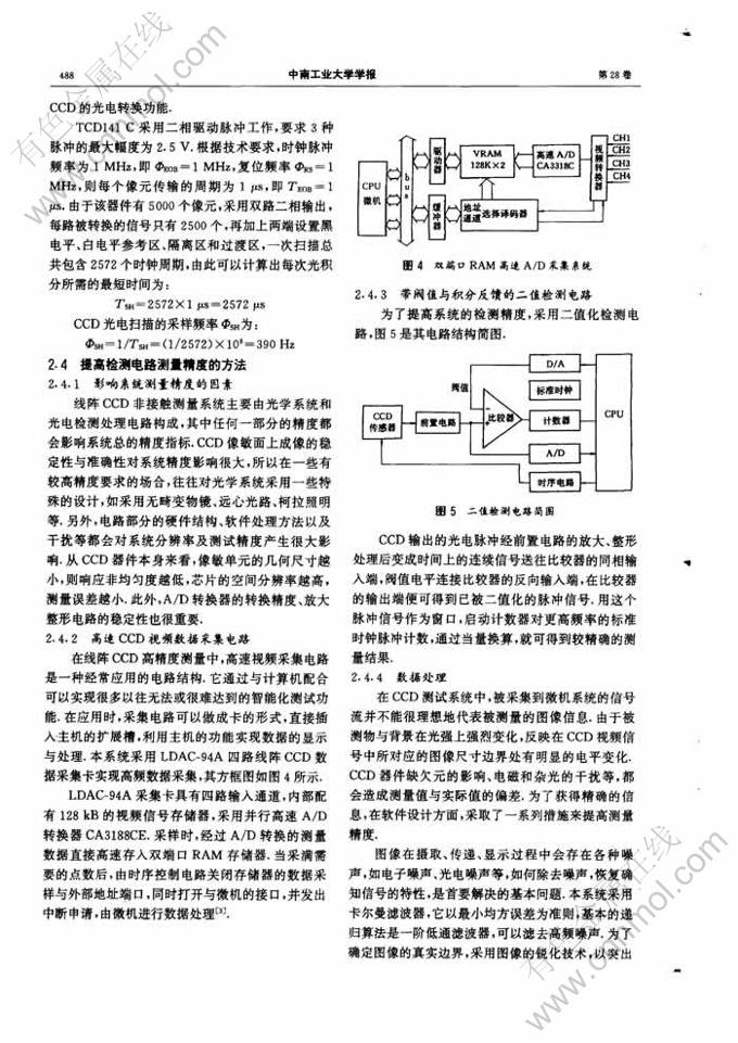 摘 要:介绍了线阵CCD传感器的工作原理、器件选择及参数确定、线阵CCD构成高精度尺寸检测系统的组成及其光学系统设计。提出了采用高速CCD视频数据采集电路、带阈值与积分反馈的二值检测电路及数字图像处理技术等措施来提高CCD检测系统测量精度的方法;并给出了应用高分辨率线阵CCD构成微机辊形检测系统的应用实例。实验结果表明,该系统具有较高的检测精度。
