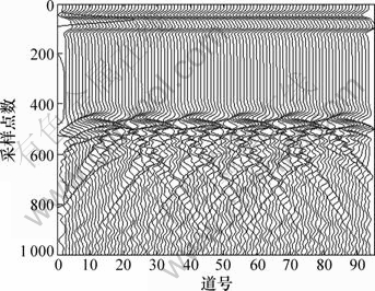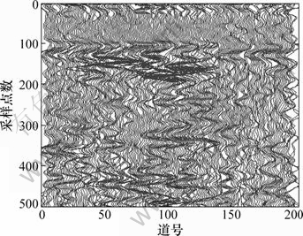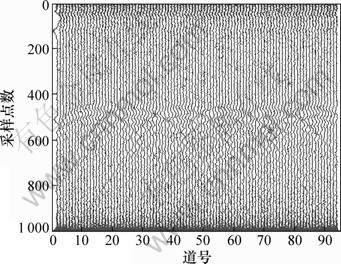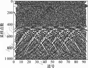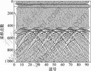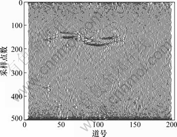 通常使用GPR进行勘探时,干扰普遍存在,如外部噪声的干扰、复杂的地下围岩的干扰等等。因而,在GPR信号处理过程中,如何消除这些干扰并从信号中得到有效的信息,这对于GPR资料的处理及解释有着重大意义。以GPR正演模拟为基础,并在GPR正演数据中加入随机噪声,以分析EMD分解的去噪效果。设定雷达模型如图2所示,其中:最上层是厚度为0.5 m的空气介质,空气层以下为素填土层,素填土的介电常数为10.0,电导率为0.002 S/m;在素填土层中设置5个金属球状异常体,金属球体的上顶埋度为6.0 m,其电导率为1.0×108 S/m,半径为1.0 m,金属球体间距为1.5 m;模拟区域长×宽为20.0 m×10.0 m。脉冲波形为Ricker子波,频率为60 MHz,脉冲位置距上边界0.48 m处,计算的网格长与宽均为0.1 m;时窗为400 ns;采样点从左边0.2 m开始,每隔0.2 m采1个点,采样过程中发送点与接收点是同步移动的,收发距为0.8 m,每道波形有1 024个采样点,共采集了94道雷达数据。采用有限差分法对该模型进行正演,其正演合成剖面如图3所示。图4所示为雷达正演数据加入随机噪声后的剖面。由图4可见:由于绕射现象及随机噪声的存在,导致信号异常混乱,GPR剖面的信噪比与分辨力大大降低。