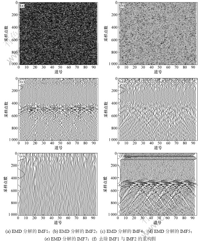 为此,利用EMD对加噪后的GPR正演剖面进行分解,得到图5所示的分解后的本征模态函数图IMF1~ IMF7。由于EMD分解实际上是一个高通滤波的过程,所以,在对信号的分解过程中高频成分被慢慢滤出,图5(a)~(b)中前2个分离出来的IMF完全是后期加入的高频噪声;图5(c)~(d)中2个IMF是雷达剖面信号的主要成分,其中图5(c)中的IMF4为金属球体的绕射异常;图5(e)所示为分解得到的IMF7,由于GPR信号的有效部分基本被分离出来,故属于金属球体的异常在图中得不到反映,后面的IMF分量图不再列出。
