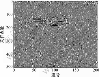 图9(a)所示为该段中比较典型的雷达原始剖面图,可见:由于隧洞中存在的钢拱架、铁丝网、电缆干扰等,导致该原始剖面异常复杂,直观感觉剖面中存在异常体,但又不能准确定位。显然,仅根据该剖面图无法对探测段进行准确的判断和地质解释。为此,先对实测信号进行EMD分解,得到了图9(b)~(e)中分解后的本征模态函数图IMF1~ IMF4(后面分量为无效信号,没有列出)。由于EMD分解实际上是一个高通滤波的过程,信号中的高频噪声成分主要集中在IMF1剖面中,故去除IMF1可达到滤波消噪的目的。图9(f)所示为去除IMF1后的重构图,该剖面中的异常信息比其在原始剖面图中要更加清晰,但仍未达到准确指导异常解释的分辨率。对EMD分解后的信号进行Hilbert变换,在此基础上,进行复信号分析以提取瞬时特征参数。图10所示为重构后的GPR瞬时振幅剖面,图11所示为重构后的GPR瞬时相位剖面,图12所示为重构后的GPR瞬时频率剖面。对比3种瞬时剖面可知:经过复信号分析处理的GPR剖面更加清晰直观,分辨率更高,由于它们分别对应地下介质不同的物性参数,故其剖面图表象各异,在这3个瞬时参数谱之中,瞬时相位谱效果最好,瞬时频率谱次之。从3个瞬时剖面中,可以清楚地分辨位于道号50~125之间采样点数150~200之间的破碎带位置,后经钻探验证。因此,根据不同的地质状况选择合适的剖面图,对信号进行分析会比直接利用原始剖面图要更加清晰、有效,它能使实测信号中异常信息的识别变得更加简单、准确。若综合3个参数的瞬时谱,利用多个参数联合评估、解释,则能达到相互验证,提高解释精度的目的。