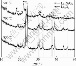The XRD patterns of La2NiO4 samples calcined at different temperatures are shown in Fig.1. After the amorphous precursor was calcined at 500 ℃ for 4 h, intense peaks for La2O3 were observed. When the temperature was increased to 700 ℃, typical diffraction peaks for the perovskite-like oxide La2NiO4, which was identified as single phase with a tetragonal K2NiF4 structure, as well as a small amount of La2O3 were observed. When the calcination temperature was increased to 850 ℃, the diffraction peaks for the spinel structure significantly intensified and became sharper, which suggests that the crystalline phase of La2NiO4 became more perfect. This result indicates that La2NiO4 with pure spinel structure can be formed by complexing citric acid with a mixture of La3+ and Ni2+ and calcining the obtained gel above 700 ℃. The specific surface areas and crystal sizes of the La2NiO4, calculated from the half-width of a diffraction peak using Scherrer formula, are listed in Table 1. Upon increasing calcination temperature, the particle sizes increased, and the specific surface area decreased dramatically. The drop in specific surface area may originate from the aggregation of the perovskite phase, which indicates the structure properties are significantly dependent on the calcination temperature.