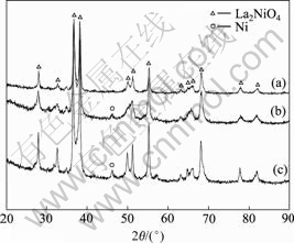 Fig.5 X-ray diffraction patterns of La2NiO4: (a) After calcination at 850 ℃; (b) After 1 h reduction at 500 ℃; (c) After reaction