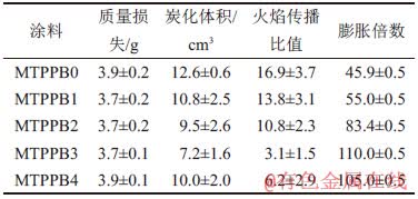 透明防火涂料(MTPPBs)在小室法和隧道法试验中的测试结果如表3所示。从表3可以看出:MTPPB0的质量损失为3.9 g,炭化体积为12.6 cm3,膨胀倍数为45.9,火焰传播比值(FSR)为16.9;当添加滑石粉后,涂层的阻燃效果随着滑石粉质量分数增加呈现先上升后下降的趋势。滑石粉主要是通过提高炭层的致密性来增强涂层的阻燃性能,而过量的talc则会降低体系中P质量分数,从而影响涂层阻燃性能进一步提高,其中MTPPB3的阻燃效果最佳,炭化体积和火焰传播比值最小,分别为7.2 cm3和3.1,与MTPPB0相比分别降低42.9%和81.6%,并且膨胀倍数最大为110.0,与MTPPB0的膨胀倍数相比增加139.7%。
