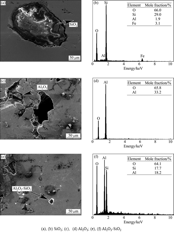 Fig. 7 Morphologies ((a), (c), (e)) and EDS spectra ((b), (d), (f)) of Si and Al oxide inclusions by in situ analysis