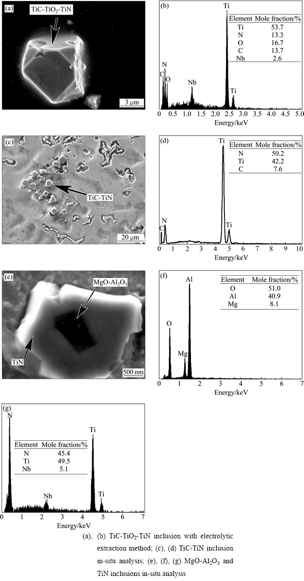 TiN通常以MgO·Al2O3为异质核心聚集长大形成,在SEM像中可以清楚地看到MgO·Al2O3和TiN这两个区域(见图10(e))。