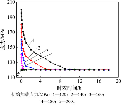 当时效温度为175 ℃、初始阶段保持恒应变时,将不同初始加载应力(120,140,160,180和200 MPa)分别松弛到120 MPa,然后在保持恒应力的条件下继续进行时效,整个时效过程的时间为18 h,应力松弛曲线如图4所示。