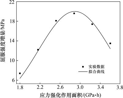 图7中,黑色方形点为不同应力强化作用面积所对应的合金屈服强度增量实验值,曲线为通过实验数据所拟合的曲线。从图7可以看出:随着应力强化作用面积的增大,合金屈服强度增量呈现先升高后降低的趋势。合金蠕变时效强化模型为
