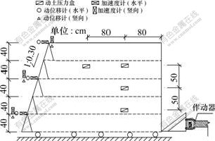 在进行动力特性参数测量时,在第1层、第3层和第5层墙顶面板上分别布置941B型拾震器(1个水平、1个竖向),用DASP数据采集系统对数据进行自动采集。为测量动应力的分布情况,在加筋挡墙中共埋设动土压力盒,在墙面安置百分表,用于测试其累计变形与沉降量[8-10]。