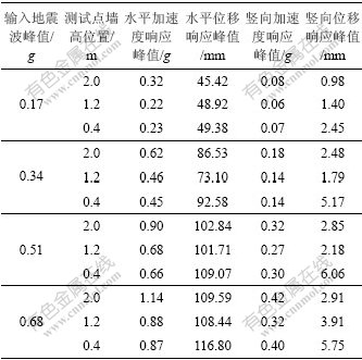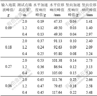 (4) 在水平地震激励下,对竖向位移特性影响不大,竖向位移沿墙高慢慢变小,在墙底时最大;水平位移随输入加速度的增加而增加,但曲线斜率变得平缓;竖向加速度随输入加速度的增加而增加。