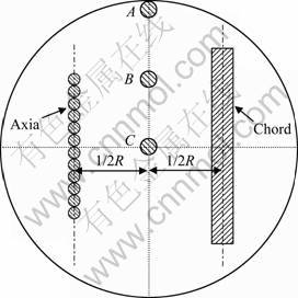 所用的试验材料为采用2种工艺锻造的规格为Φ300 mm的大规格棒材,合金成分见表1。大棒材显微组织及力学性能取样方法如下:对于金相试样,沿大棒材半径方向,从外向里在30 mm、90 mm和150 mm 3个位置取样(见图1),进行锻态和热处理态金相组织观察。力学性能试样沿R/2处取样,对应的金相组织见图1中B位置,沿轴向和弦向2个方向取样;然后,对试样毛坯进行热处理,热处理制度为(1 015 ℃,2 h,AC)+(700 ℃, 2 h,AC)。金相试样经100#SiC砂纸粗磨→精磨→机械抛光→化学腐蚀后,在德国生产的MEF4A光学显微镜上进行金相观察,拉伸试验所用设备为德国生产的Zwick万能拉伸试验机。