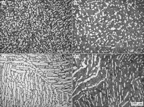 研究2种热加工工艺下的大规格棒材,工艺编号分别为K1和K2。图2和3所示分别为K1和K2条件下的金相组织。由图2可见,K1大棒材显微组织形貌沿径向略有差别,靠近表面区域的变形比较充分(见图2(a));锻态组织基本已等轴化,对应的热处理态组织为典型的双态组织,等轴初生相体积分数在20%~30%(见图2(b));在靠近心部,由于变形不够充分,有的区域尚存在未完全破碎的晶界a相,a相多呈长条状,在这些长条状a相之间,有细小的次生a相存在。由于大棒材心部冷速较慢,这些原本是细条状的a相发生了再结晶,变成细棒状(见图2(a?))。对应的热处理态组织中初生a相长成条状(见图2(b?))。