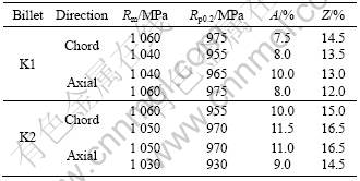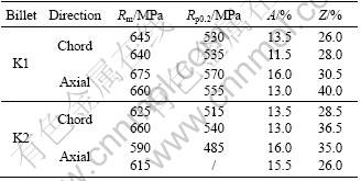 表3所列为K1、K2 条件下大棒材的600 ℃拉伸性能。由表3可见,K1大棒材的弦向和轴向强度相当,在轴向的塑性略优于弦向的;而K2大棒材弦向的强度高于轴向的,但塑性相当。K1和K2比较,二者弦向性能相当,但轴向强度K1高于K2。
