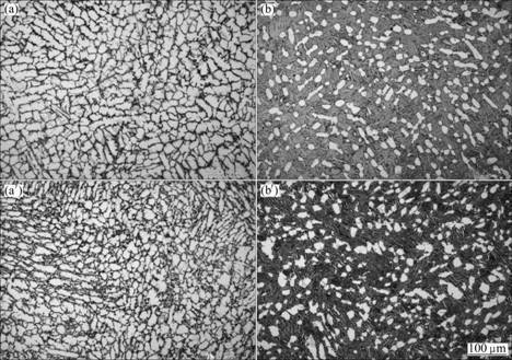 Fig.3 Microstructures of different sampling locations of K2 large-section bar: (a), (a?) Forged condition; (b), (b?) Heat treatment condition