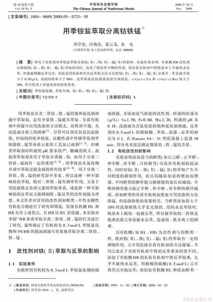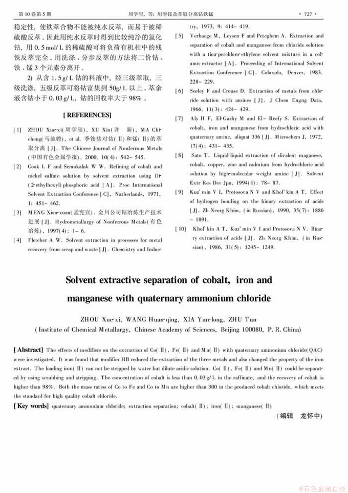 Key words:quaternary ammonium chloride; extraction separation; cobalt(Ⅱ); iron(Ⅱ); manganese(Ⅱ)