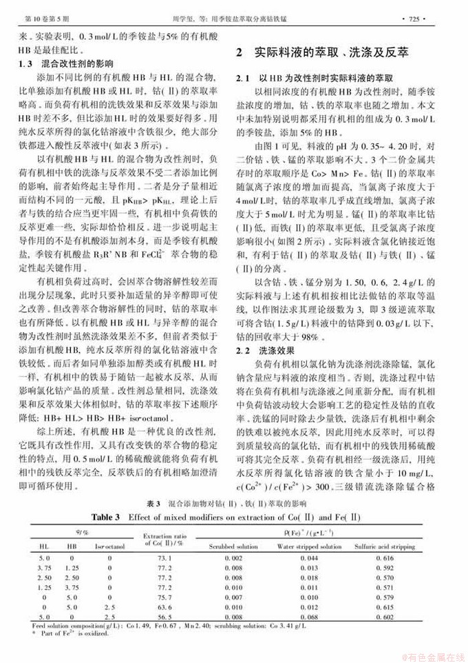 摘 要:研究了改性剂对季铵盐萃取分离钴(Ⅱ)、 铁(Ⅱ)、 锰(Ⅱ)的影响。 实验结果表明,有机酸HB改性剂在抑制钴(Ⅱ)、铁(Ⅱ)、 锰(Ⅱ)萃取的同时, 改变了铁的萃合物的性质, 使负荷有机相中的铁基本上不被纯水反萃, 但能被稀酸反萃完全, 因此采用洗涤和分步反萃的方法可以把钴(Ⅱ)、 铁(Ⅱ)、 锰(Ⅱ)分离开。 萃余液含钴小于0.03 g/L, 钴的回收率大于98%。 反萃的氯化钴溶液杂质含量较低, c (Co)/ c (Fe)和 c (Co)/c (Mn)均大于300,符合优质工业氯化钴的质量要求。