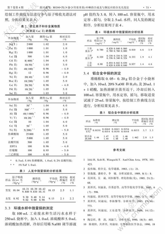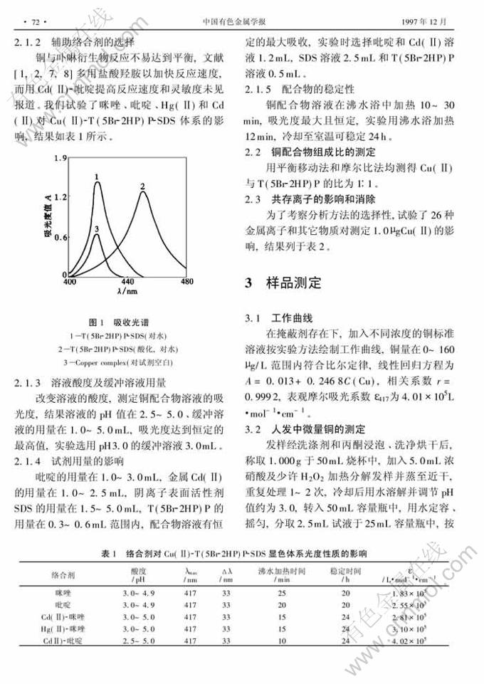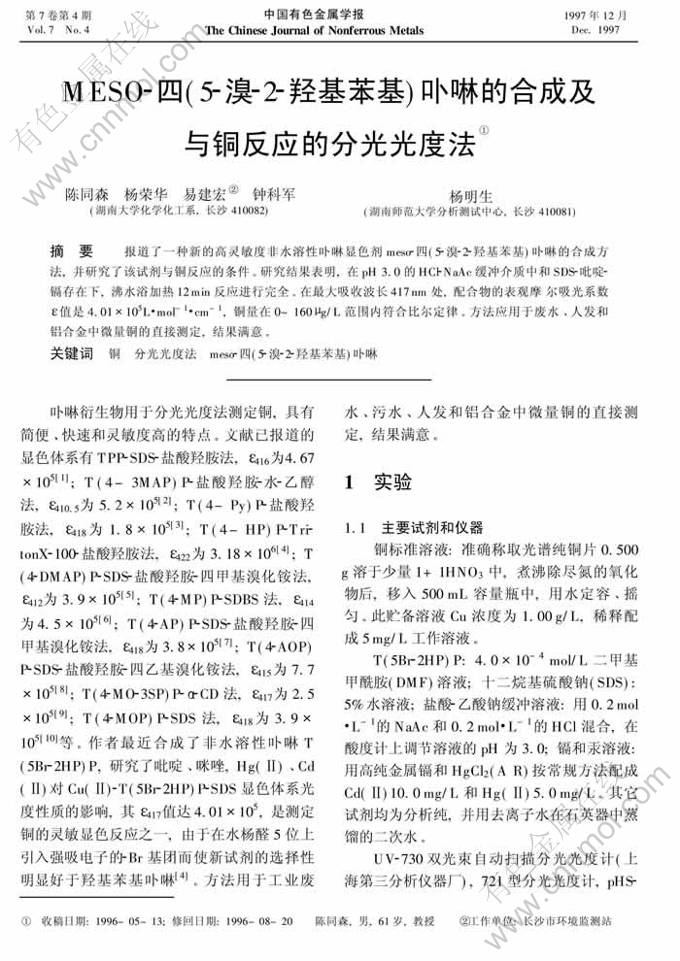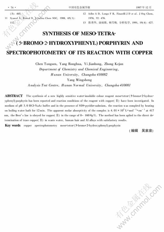 关键词:铜 分光光度法 meso-四(5-溴-2-羟基苯基)卟啉