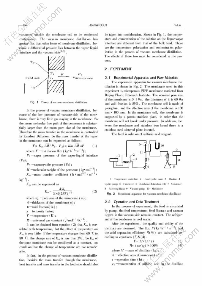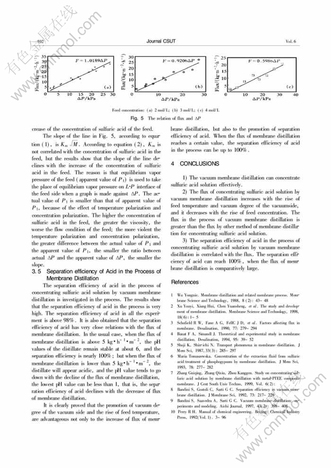 Abstract: Concentrating sulfuric acid solution by vacuum membrane distillation with flat PEFEmembrane is explored. The effects of sulfuric acid concentration, temperature of the feed, the vacuum degree of the vacuum side on the flux of membrane distillation and the separation efficiency of acid are investigated. The results illustrate that the flux of the membrane distillation increases with the rise of feed temperature and the vacuum degree of the vacuum side, but it decreases with the rise of the sulfuric acid concentration of the feed. The separation efficiency of acid is correlated with the flux of membrane distillation; the separation efficiency of the acid can amount to 100% in the process, when operative conditions are properly controlled. It can also been obtained from the experiment that, compared with other methods of membrane distillation, the vacuum membrane distillation can obtain greater distillation flux.