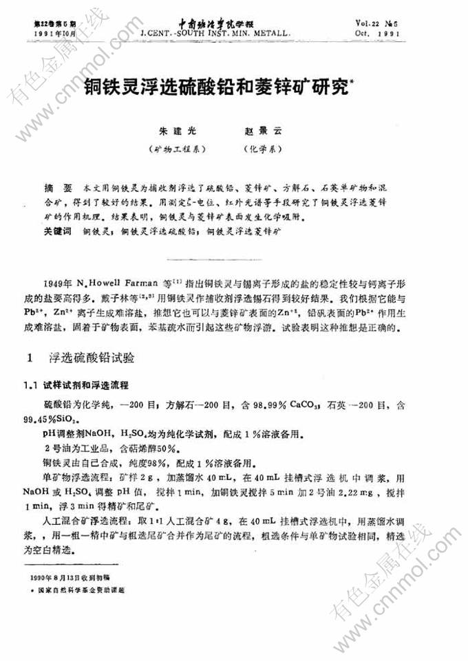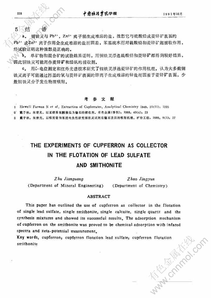 Key words:cupferron; cupferron flotation lead sulfate; cupferron flotation smithonite