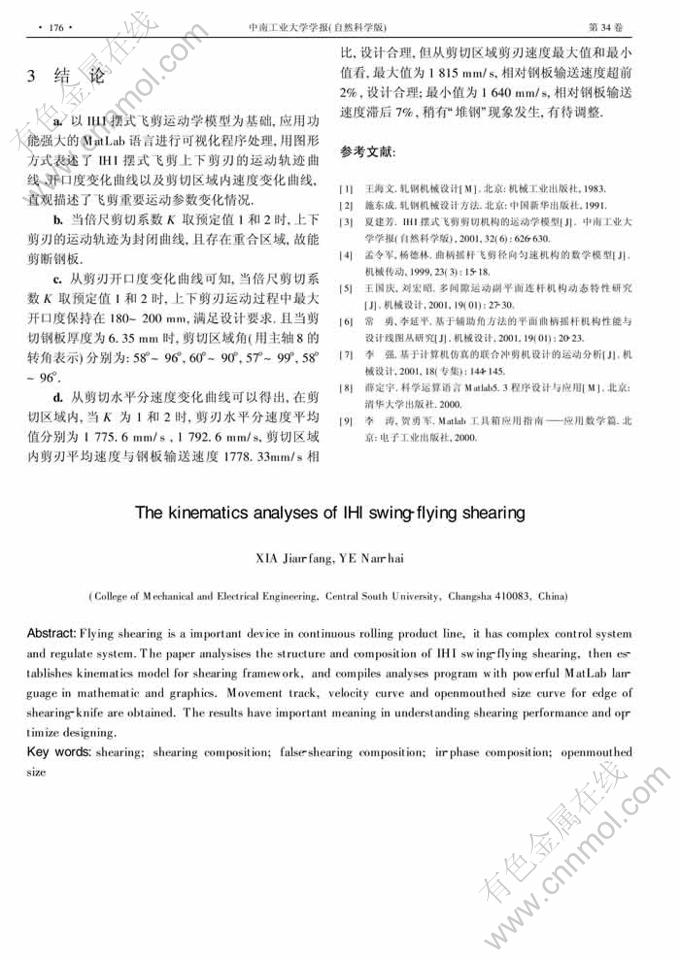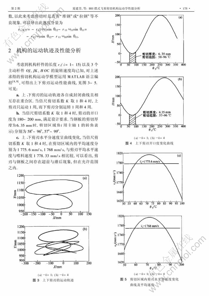 摘 要:飞剪是钢铁生产企业连续轧制生产线上的重要设备,其结构设计、控制与调整很复杂,其工作性能与连续轧制生产线的生产效率密切相关.作者分析了IHI摆式飞剪结构及传动原理,建立了剪切机构运动学数学模型;应用Matlab程序设计语言强大的数学计算和图形处理功能,将剪切机构运动学模型程序化、数值可视化,得出飞剪上、下剪刃的运动轨迹曲线、速度曲线以及剪刃开口度变化曲线,这对了解飞剪运动全过程和定量分析剪切机构工作性能,合理建立剪切机构优化设计模型具有参考价值.