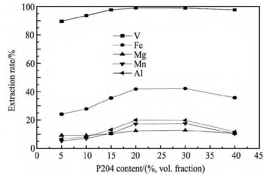 图1 P204 用量对 V,Mg,Fe,Mn,Al 元素萃取率的影响 Fig.1 Effect of P204 dosage on extraction rates of elements V, Mg,Fe,Mn and Al
