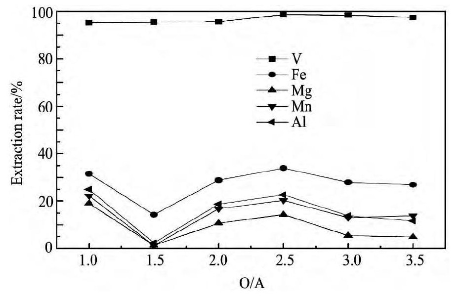 图2 相比( O/A) 对元素 V,Mg,Fe,Mn,Al 萃取率的影响 Fig.2 Effect of phase ratio ( O / A) on extraction rates of elements V,Mg,Fe,Mn and Al
