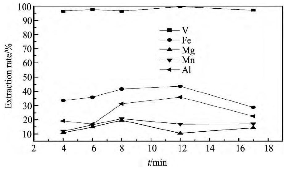 图3 震荡时间对元素 V,Mg,Fe,Mn,Al 萃取率的影响 Fig.3 Effect of mixing time on extraction rates of elements V, Mg,Fe,Mn and Al