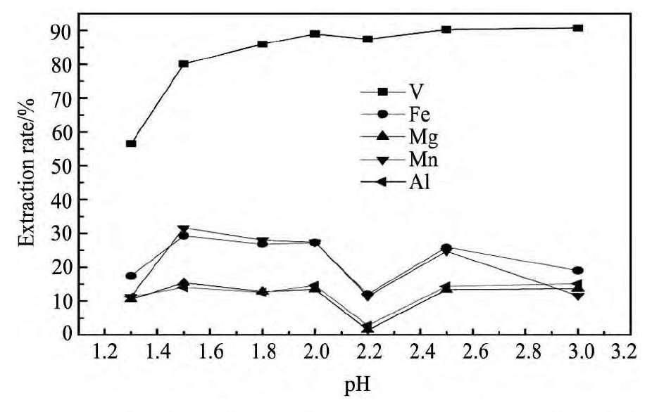 图4 水相初始 p H 值对元素 V,Mg,Fe,Mn,Al 萃取率的 Fig.4 Effect of initial p H value of aqueous phase on extraction rates of elements V,Mg,Fe,Mn and Al