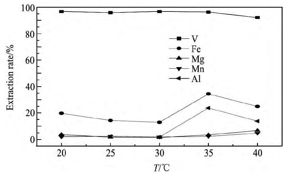 图6 萃取温度对元素 V,Mg,Fe,Mn,Al 萃取率的影响 Fig.6 Effect of temperature on extraction rates of elements V, Mg,Fe,Mn and Al