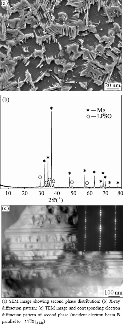 Mg-Gd-Y-Zn-Zr alloy was prepared referring to YANG et al [30]. Practical chemical composition of the alloy analyzed by inductively coupled plasma spectrometer (ICP) is Mg-11.80Gd-3.42Y-1.91Zn- 0.35Zr (mass fraction, %) or Mg-2.1Gd-1.1Y-0.82Zn- 0.11Zr (mole fraction, %). Note that mole fraction is used for the alloy compositions unless otherwise specified in this study.