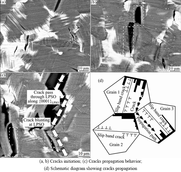 Micro-crack initiation generally occurred on the specimen surface (Figs. 6(a)-(c)) at the following sites: 1) interiors of the LPSO structures; 2) basal slip bands of {0001}α-Mg and 3) interfaces between α-Mg and LPSO structures (marked by white dashed box). Experimental observations showed that the interfaces between α-Mg and LPSO structures were preferential sites for crack initiation. This finding was ascribed to different hardness between LPSO structures and α-Mg. The hardness of 18R-type LPSO structures is higher than that of α-Mg [23]. Thus, LPSO structures cannot exactly match the deformation of the α-Mg during cyclic loading. Therefore, the micro-cracks were preferentially initiated at the interfaces between the magnesium matrix and LPSO structures.