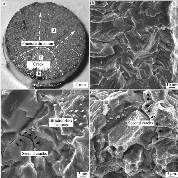 3) Secondary crack nucleation preferentially occurred at the grain boundaries at the fatigue crack propagation and final static failures stages. Therefore, the fracture characteristics changed from cleavage to mixed mechanisms with a few shallow dimples distributed on the facets.