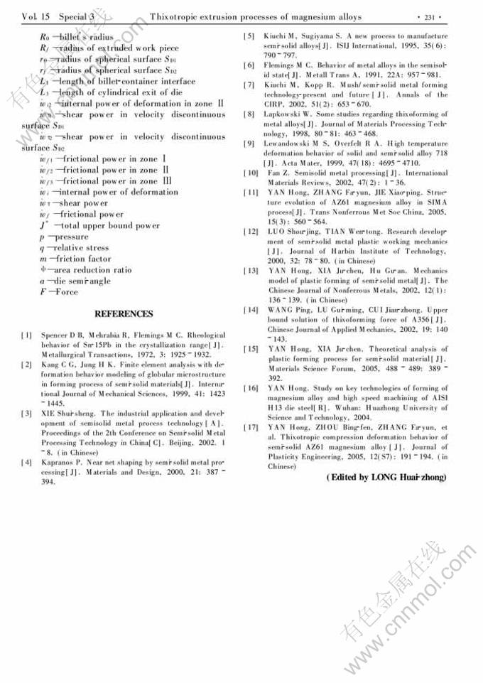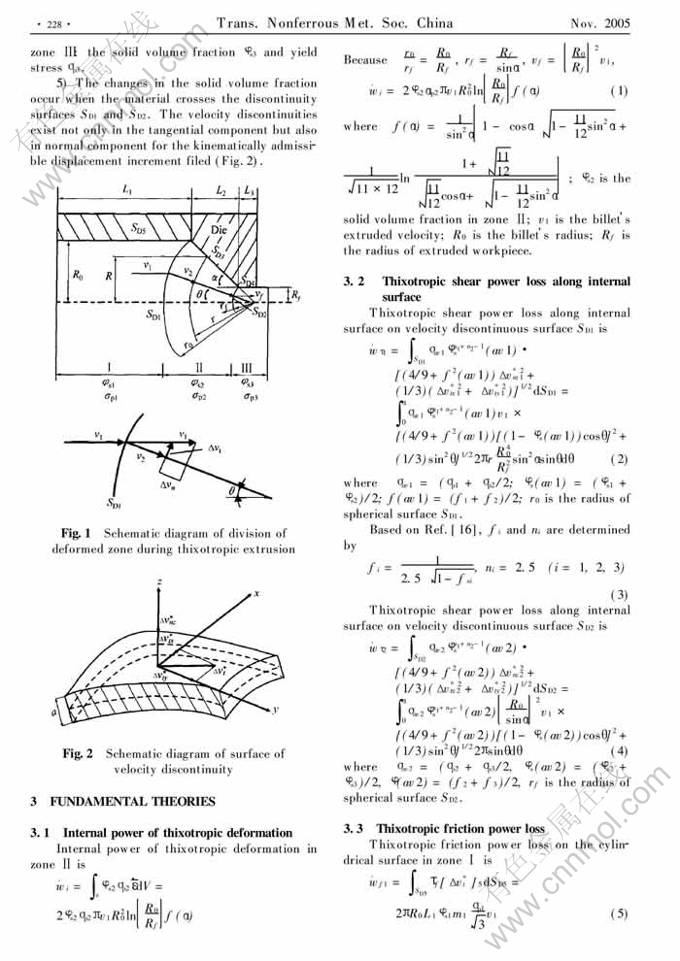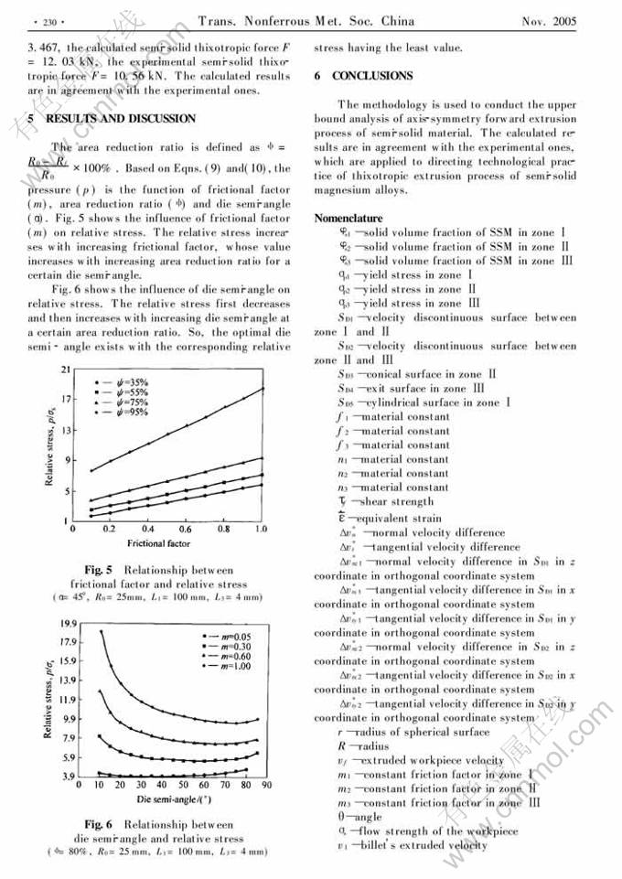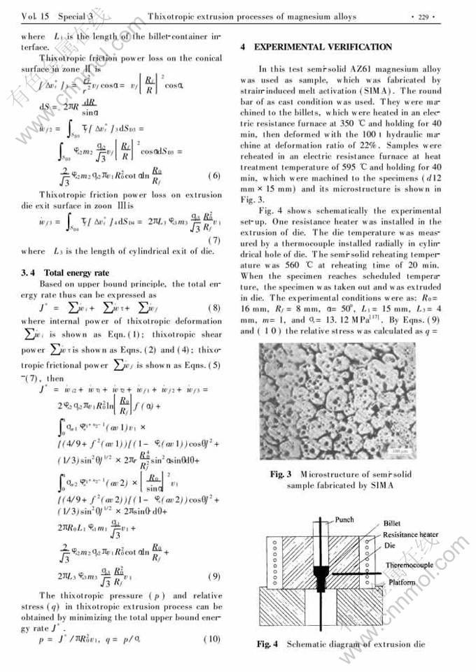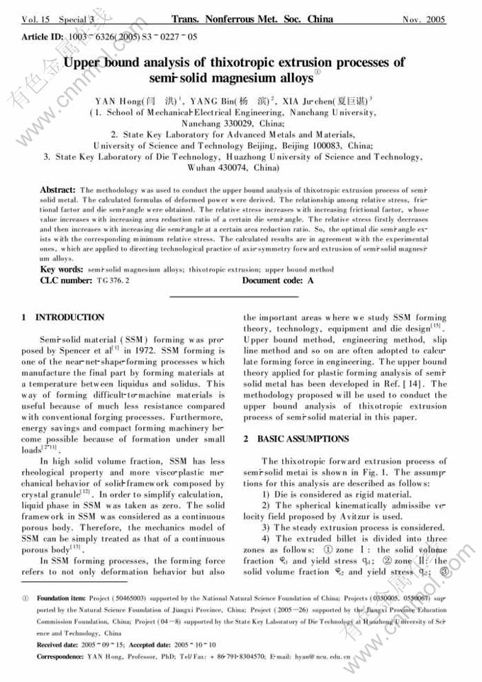 Key words:semi-solid magnesium alloys; thixotropic extrusion; upper bound method
