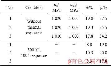 表2分别给出了3种工艺获得的Ti40合金90 mm 方棒的室温拉伸、热稳定性能。可以看到:3种工艺获得的棒材室温拉伸性能没有明显差异,拉伸强度和伸长率均比较接近。热稳定性能由试样经500 ℃、100 h热暴露后测试的室温拉伸塑性来表征,与未经热暴露的试样相比,试样热暴露后室温拉伸的伸长率和面缩率降低了50%左右,但3种工艺热稳定性差别很小。