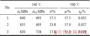 表3所列为Ti40合金90 mm方棒的540 ℃拉伸性能和500 ℃、250 MPa、100 h条件下的蠕变性能。与室温下相近,3种工艺的高温拉伸强度和塑性相差不大,组织略粗的棒料的蠕变性能更好一些。