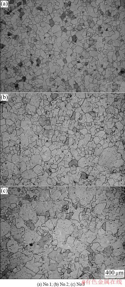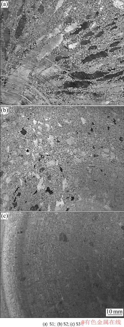 本研究所用的Ti40合金d 300 mm棒料端面低倍组织见图1,组织均匀性及晶粒尺寸差异较大。从d 300 mm棒料到冲孔芯料仅经历了一火镦粗和冲孔变形,可以推断出相同工艺获得的3个冲孔芯料中S1的冲孔芯料组织最粗、并且最不均匀;S3的冲孔芯料组织最细、最均匀;S2的组织应介于前两者之间。