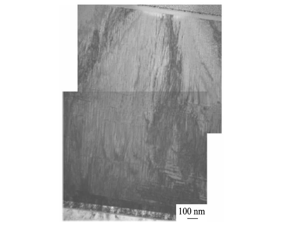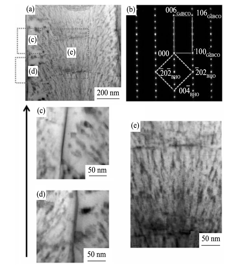 图1 0 膜厚2.2μm, 掺杂浓度为20%Zr的Gd YBCO的复合薄膜中贯穿整个薄膜的BZO纳米柱的微观结构截面图Fig.10 Cross sectional microstructure of a 2.2μm thick Gd Y-BCO tape with 20%Zr addition showing well-aligned Ba Zr O3nanocolumns throughout film thickness[20]