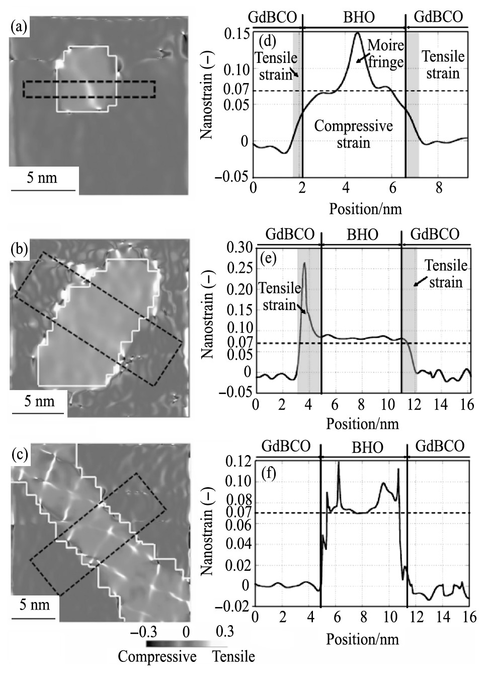 为了了解APCs在这3个界面应力场下的存在形式, Maedaa等[12]研究者探究了BaHfO3 (BHO) 掺杂的GdBa2Cu3O7-x (GdBCO) 复合薄膜中APCs的行为特征。如图3所示, 在整个薄膜体系中, 晶粒内部与晶粒边缘处BHO的行为存在明显不同。在晶粒内部, BHO纳米粒子以纳米棒的形式存在且斜角很小;而在晶界边缘处, BHO则会以面状、球状、以及纳米棒状的混合形态出现, 并且具有大的倾角。从几何相分析 (geometrical phase analysis, GPA) 的分析结果可以发现, 局部应力更可能出现在小的BHO纳米棒与Gd BCO母体之间的界面, 且这种局部应力从界面处向Gd BCO母体内急剧衰减;而对于长的BHO纳米棒, 由于晶格失配的作用缓解了晶格变形的结果, 从而导致局部应力的消失。图4展示了不同尺寸的BHO纳米棒对应的应力分布图。