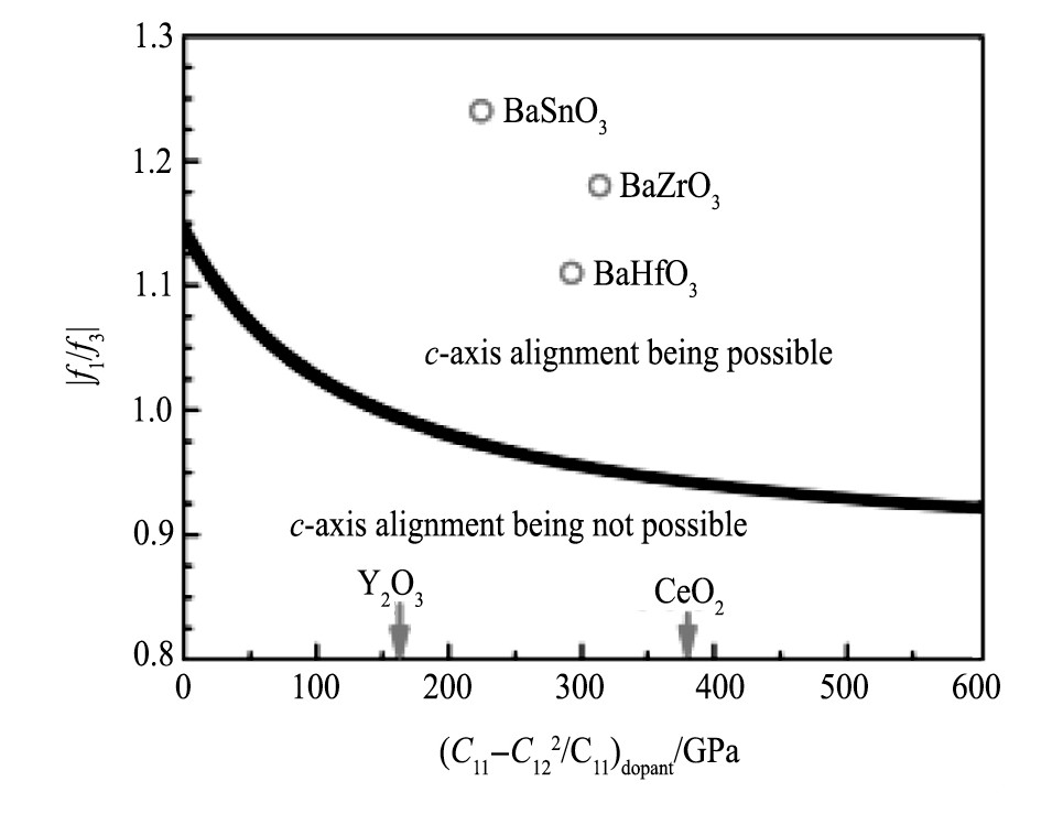 Gautam等[13]将复合薄膜放在两个界面的弹性应变场模型中考虑, 这两个界面分别是APCs与RE-123之间的界面, RE-123与衬底之间的界面。由于通常情况下APCs的掺杂浓度非常低, 所以APCs与衬底之间的界面可以忽略。通过绘制复合薄膜中APCs与YBCO之间的晶格失配以及弹性常数对APCs的形态的影响函数关系可以发现, 这个函数关系的曲线定义了两个区域。曲线以上为能量上有利于一维c轴取向的APCs形成的区域, 曲线以下是能量上不利于一维APCs形成的区域。如图5所示。其中