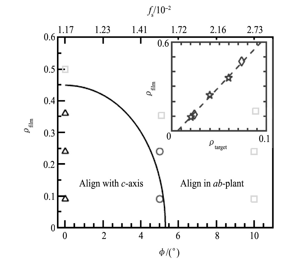 另有研究表明, 衬底与YBCO母体之间的晶格失配以及APCs的掺杂浓度对于一维APCs的形态也具有重要影响。当衬底与YBCO之间的晶格失配很小且掺杂浓度相对较低时, c轴取向的纳米棒在能量上处于更有利的状态, 此时掺杂剂与YB-CO之间由于晶格失配而产生的应力场是纳米颗粒自组装过程中的主要驱动力;而在YBCO与衬底间存在较大晶格失配的情况下, 这种晶格失配会导致YBCO晶格发生扭曲从而改变纳米棒的形态[14]。例如在正的晶格失配下, YBCO的ab面处于张应力状态 (也可以说c轴方向上处于压缩状态) , 在小的张应力和低的APC浓度下, c轴排列的一维BZO APCs在能量形成上更有利。图6显示的是APCs的密度ρfilm和衬底与YBCO之间的晶格失配fs共同作用下的一维APCs取向图。插图是薄膜中APCs的密度ρfilm与靶材中第二相粒子密度ρtarget的线性关系。从图6中可以看出, 当BZO的密度及晶格失配fs越大时更容易形成沿ab面取向排列的纳米片。反之则更易形成c轴取向的纳米棒。